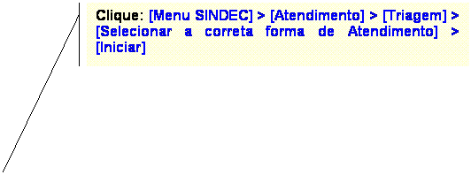 Para acessar a tela Cadastro de Consumidor, no MENU SINDEC “clique” em [Atendimento] > [Triagem] > [Forma do atendimento] > [Iniciar].